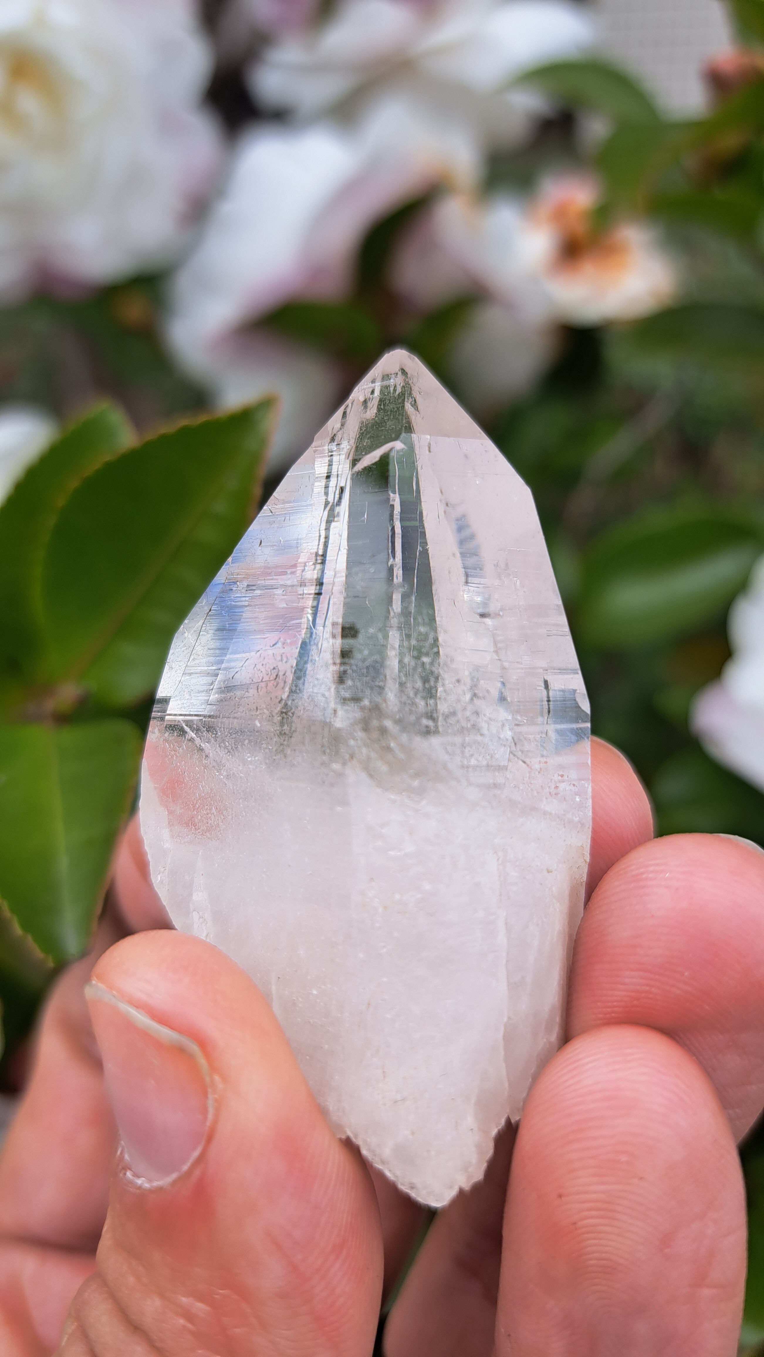 バーコード状の成長線が光をプリズムのように反射する照りのある水晶ポイントです