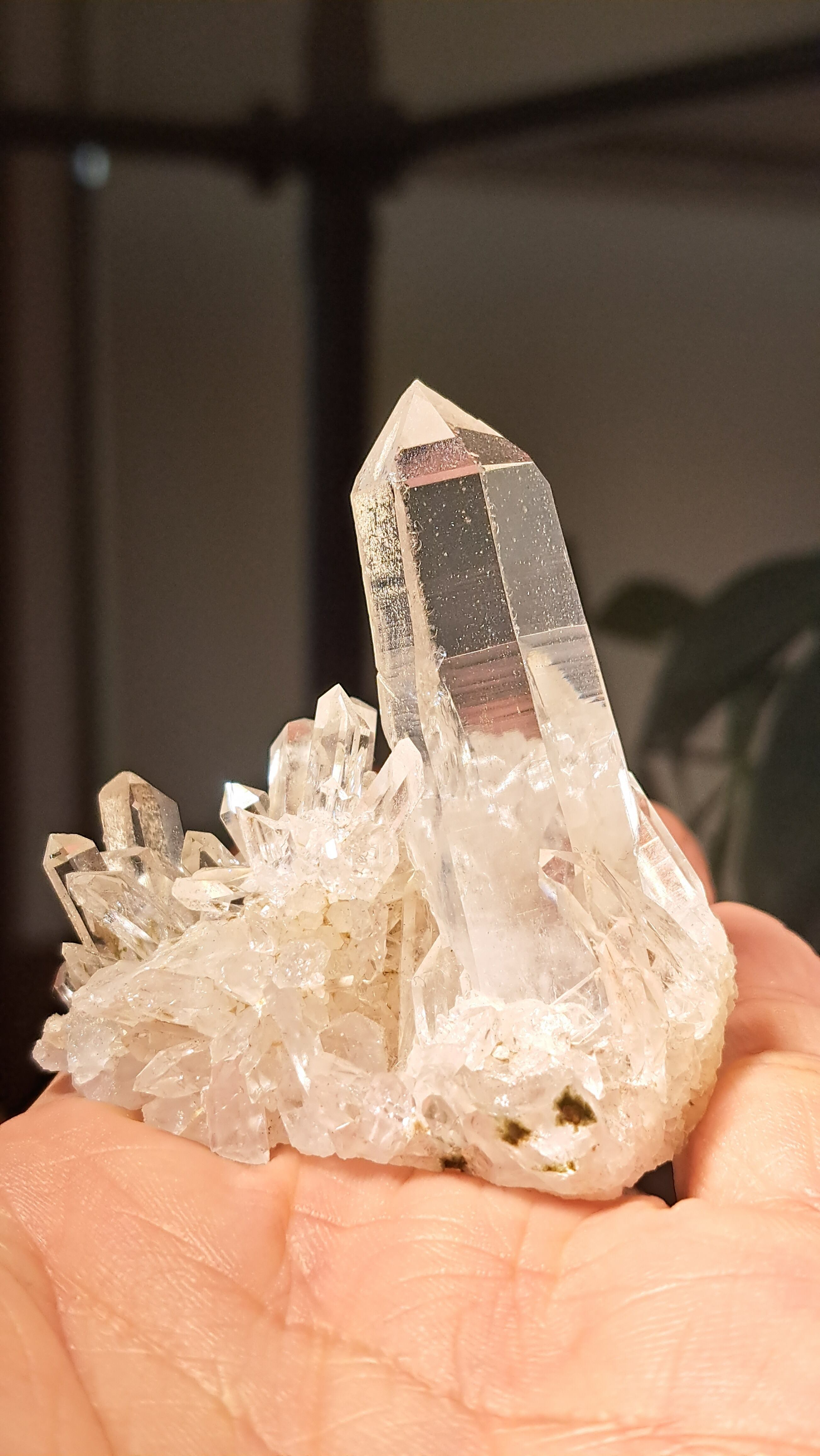 メインのポイントと、それを囲む小さな結晶が美しいバランスを保っているクラスターで